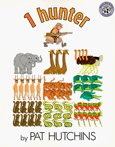 One hunter walks through the forest observed first by two elephants, then by three giraffes, and so on.